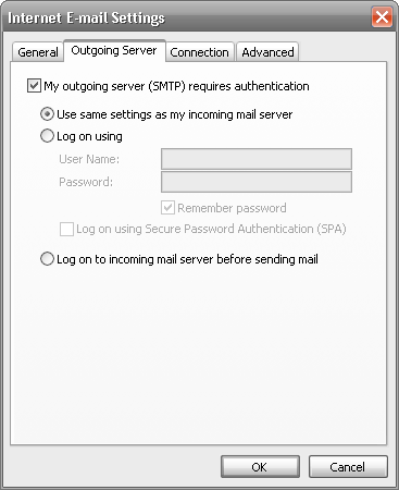 If you choose to use mail.efxi.net for your "Outgoing mail (SMTP) server" and not your ISPs SMTP server you should add the following setting for "SMTP Authentication" (this is required): Select the More